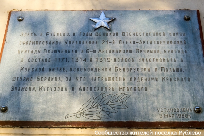 21-я легко-артиллерийская бригада была сформирована в Рублёво приказом Верховного главнокомандующего от 15 декабря 1942 года. Первым её командиром был назначен полковник Иванов Василий Николаевич, начальником политотдела – подполковник Гнитлев Михаил Никитович. Мемориальная доска на здании бывшей школы 580