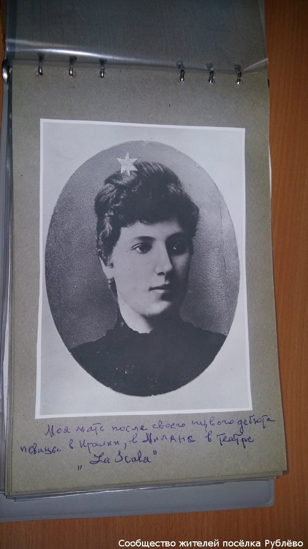 — В свое время мама окончила по пению курсы филармонии, она училась у профессора Бежевича, в одном классе с Леонидом Витальевичем Собиновым, с ним вместе кончала класс и пела дуэты на выпускном экзамене. А потом она совершенствовалась в Италии, в Милане, дважды выступала в оперном театре «Ла Скала»…