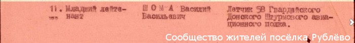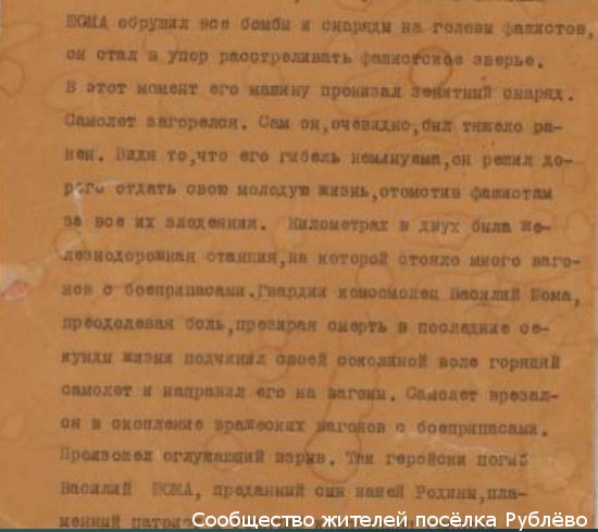Когда на советскую землю предательски напали фашисты, Вася Шома сам стал в ряды Советской Армии. В одном из боёв с немецкими захватчиками самолёт лётчика-штурмовика, орденоносца Василия Шома был подбит, а сам лётчик ранен. Он уже не мог сражаться. И тогда Шома заставил свою машину дотянуть до занятой фашистами железнодорожной станции и врезался горящим самолётом в немецкий эшелон с боеприпасами. Комсомолец Вася Шома отдал свою жизнь за Родину.»