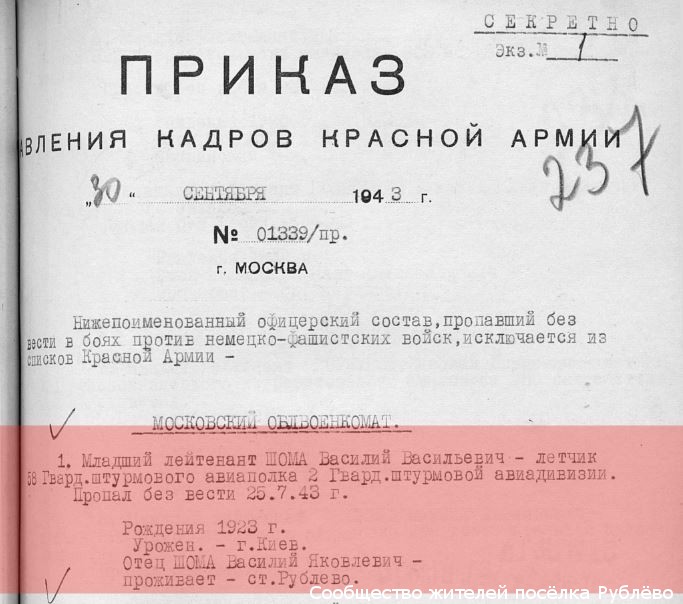 Василий Шома родился в 1923 году в Киеве, жил в Рублёво. О Василии Шома рассказывает директор рублёвской школы К.Г.Дутова в своей статье в журнале "Пионер" за 1949 год: «…рисунок, сделанный когда-то учеником IV класса Васей Шома. В этом рисунке отразилась горячая любовь мальчика к Красной Армии: он нарисовал бойца времён гражданской войны, идущего в атаку.
