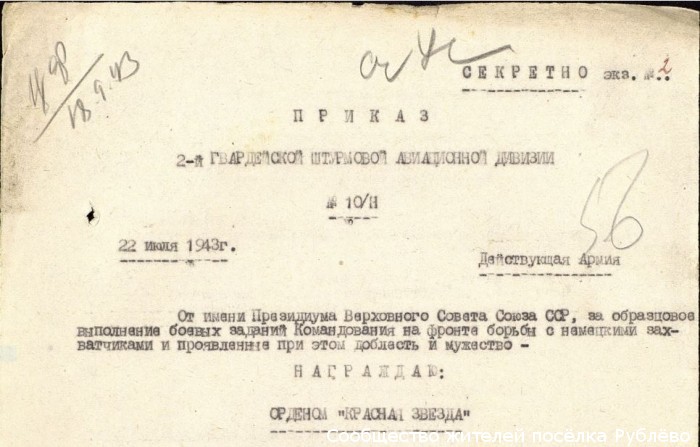 За эти дни два раза был подбит над целью ЗА [зенитной артиллерией] противника но в обоих случаях не терял самообладания и горя желанием спасти свой самолёт и саму жизнь, чтобы продолжать громить врага, - перетягивал самолёт через линию фронта и благополучно садил его на аэродроме.