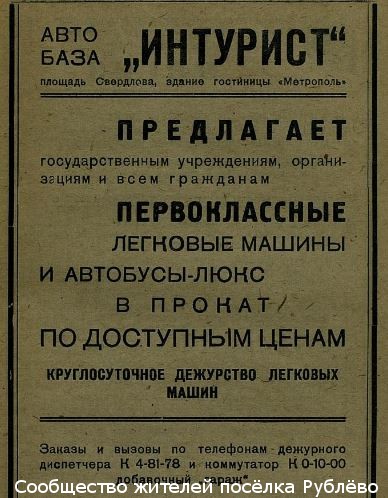 Если же вам нужно было выехать из Рублёво, например, в бутербродную на ул.Горького с максимальным комфортом, то прокат первоклассных легковых машин по доступным ценам от автобазы "Интурист" к вашим услугам.