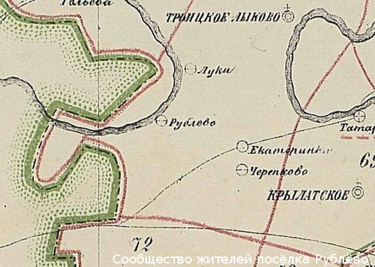 Карта Московского уезда, на которой показаны районы церковных приходов и волостей. В 1873 г. в Рублёво проживали от 100 до 300 человек. (Издание Московскаго губернскаго земства, 1877)