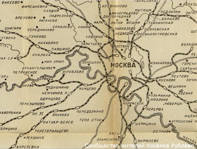 Буфет на ст.Павшино, чайная в Архангельском, в Рублёве рабочая столовая. Купанье в старице в Архангельском. Строго запрещается купаться в реке на 3 км выше станции.