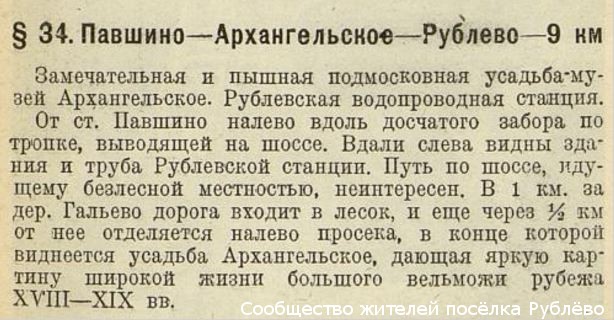 От ст.Павшино налево вдоль досчатого забора по тропке, выводящей на шоссе. Вдали слева видны здания и труба Рублёвской станции. Путь по шоссе, идущему безлесной местностью, неинтересен. В 1 км за дер.Гальёво дорога входит в лесок, и ещё через 1/2 км от неё отделяется налево просека, в конце которой виднеется усадьба Архангельское, дающая яркую картину широкой жизни большого вельможи рубежа XVIII-XIX вв.
