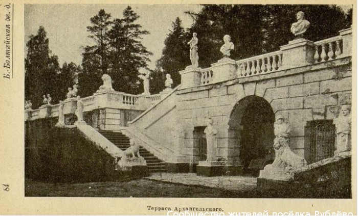 Замечательно разработан спуск с верхней террасы парка на нижнюю по каменным лестницам, украшенный статуями и баллюстрадой с бюстами. На нижней террасе среди подстриженных аллей широкий партер с рядами скульптур по краям. За обрывом последней террасы старица реки Москвы, которая до половины XIX в. текла по этому руслу. В правой части парка, если стоять лицом к реке, памятник Екатерине II в маленькой беседке, в левой, около дома - памятник Пушкину. Характерная черта культа императрицы, царствование которой было расцветом дворянских привилегий. Усадебные постройки расположились и вне парка. Налево от выхода со двора, невдалеке от шоссе б. театр, рассчитанный на 400 мест. Направо, за небольшой рощей, многочисленные хозяйственные постройки, занятые санаторием, а вниз по берегу - домом отдыха. В глаза бросаются большой классический мавзолей недавней постройки, использованный под клуб, и нарядные ампирные ворота, ведущие к церкви XVII в., на краю высокого обрыва, поросшего лесом. С обрыва, немного дальше церкви, развёртывается огромный вид на проходящее внизу старое русло реки и на далеко отошедшую от Архангельского реку. От церкви начинается большак, ведущий в д.Захарково, от которого к реке идёт низкий ровный берег. На противоположном правом берегу Рублёвская водопроводная станция. Станция открыта в 1903 г., когда рост Москвы сделал совершенно недостаточным старый Мытищинский водопровод. Ежедневно станция нагнетает в резервуар на Воробьёвых горах до 20 млн. литров воды, предварительно прошедшей отстойники и фильтры. Но сейчас уже и Рублёвская станция, и водяные запасы реки Москвы не удовлетворяют вполне потребностей стремительно растущего города, и перед Москвой стоит задача постройки нового более мощного водопровода.