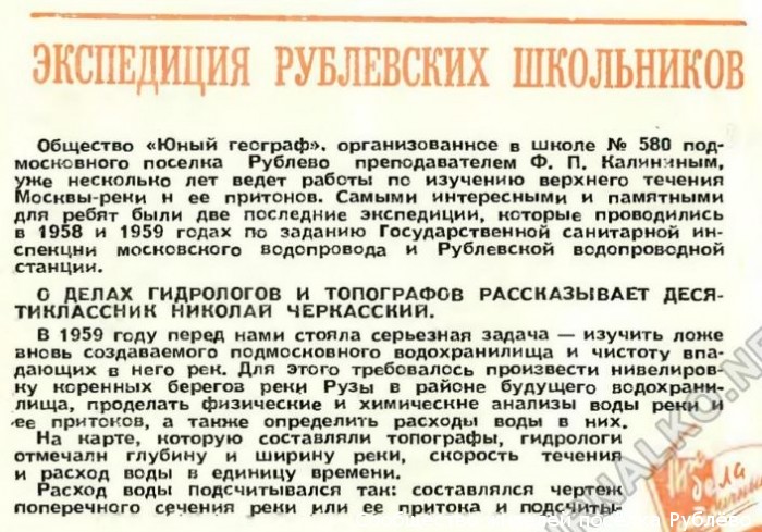 В этой работе принимало участие 17 школьников старших классов. Исследовательская работа была осуществлена по заданию управления Рублёвского водопровода, обеспечивающего водоснабжение Москвы. Перед экспедицией были поставлены задачи исследовать: а) за счёт каких источников питается Москва-река; б) где она загрязняется; в) какие болота придают её воде болотный привкус.