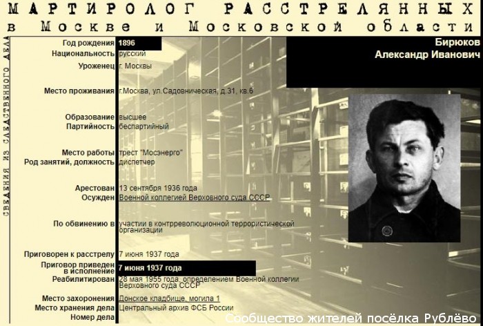 - Не совсем так. Его тоже взяли, когда начались процессы промпартии, - поведал нам его правнук, кстати, в прошлом журналист-международник, а сегодня работает на телеканале "Россия". - Мне пока не удалось обнаружить документы за этот период, но в семье было известно, что один генерал НКВД, фамилии его никто уже не помнил, забрал прадеда в Кузбасс. То есть под судом прадед не был, забрали его по-тихому, как спеца. Он там построил не то гидроэлектростанцию, не то водонапорную систему, и через два года его отпустили. Он вернулся в Москву в дом старшей дочери. Вскоре случилась страшная трагедия: его единственного сына репрессировали и расстреляли в Донском монастыре. За что? В семье не говорили. Знаете, тогда вообще все были страшно напуганы происходящим - и ссылкой Бирюкова, и смертью его сына. Об этом больше молчали. Но Кузбасс и гибель сына - всё это серьёзно подорвало Бирюкова...