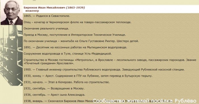 Дед, Иван Михайлович Бирюков , — человек в истории Москвы легендарный. Именно он был непосредственным строителем столичного водопровода , Рублевской водозаборной станции . В 1910 году водопровод этот был признан лучшим в мире, а Иван Михайлович , первый житель Рублевки — у него там был построен дом, — удостоился чести называться почетным гражданином Москвы.