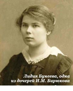 Отец выбрал профессию режиссёра. Когда ещё постигал её азы, был любимым учеником у Сергея Эйзенштейна. Что же касается Лидии Ивановны, то она связала свою судьбу с медициной. В гражданскую войну бабушка участвовала в борьбе с эпидемией чёрной оспы в Средней Азии. В это же время она познакомилась со своим будущим мужем Бунеевым, врачом-психиатром. После войны в знак благодарности ей дали квартиру на Остоженке, целый этаж, который быстро заселился однополчанами и родственниками. Родившийся в 1921 году у Лидии Ивановны сын Борис раннее детство провёл в доме Бирюкова на Рублёвской станции. Великую Отечественную войну Лидия Ивановна прошла с санитарным поездом. У неё было много военных наград, Орден Ленина. После войны она работала директором дома ребёнка в Москве, а её муж возглавлял институт судебной психиатрии".