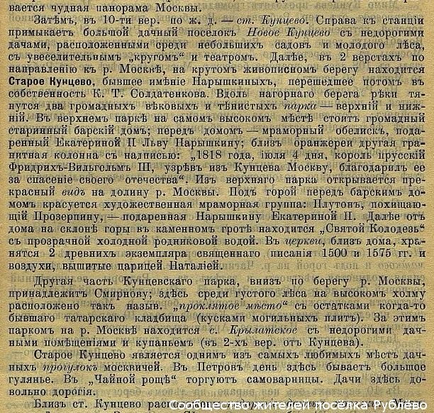 О Новом Кунцево (недорогие дачи) и о Старом Кунцево (бывшее именее Нарышкиных, потом К.Т.Солдатенкова, дорогие дачи). Упоминается "проклятое место" в Кунцевском парке и Крылатское (дешёвые дачные помещения).