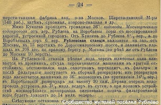 Мимо Кунцева проходят громадные 36-дюймовые водоводы Москворецкого водопровода от дер.Рублёво на Воробьёвы горы с шоссированной дорогой, устроенной городом. От Кунцева до Рублёва 8,5 вёрст, а до Воробёвых гор 6 вёрст. Рублёвская станция находится на запад от Москвы, в 15 верстах по Дорогомиловскому шоссе, и занимает площадь в 108 дес. по правому берегу р.Москвы (по реке же от Рублёва до Москвы 50 вёрст).