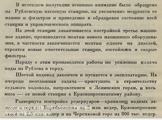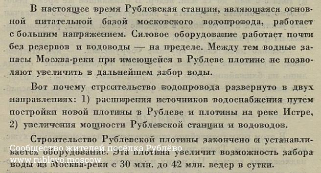 О необходимости увеличения мощности Рублёвской водопроводной станции и строительстве плотины писал в 1932 году председатель исполкома Моссовета Н.А.Булганин в своём докладе "О социалистическом переустройстве Москвы".
