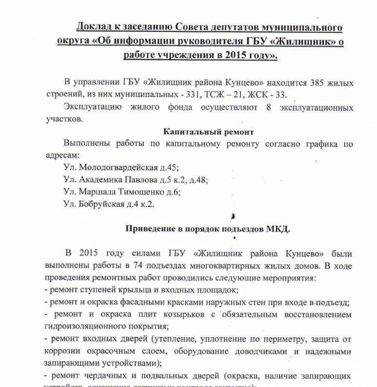 Статьи О районе Кунцево Управляющая организация Отчёт о работе ГБУ «Жилищник» в 2015 году Отчёт о работе ГБУ «Жилищник» в 2015 году Тип статьи: Авторская Отчёт директора ГБУ «Жилищник» И.В.Русанова о работе учреждения в 2015 году, а также запланированные работы по благоустройству дворов в 2016 г..В Рублёво — Обводное ш.,4, и Новорублёвская ул. Ещё в отчёте есть финансовая составляющая «Жилищника». Файл: Читать онлайн | Скачать | 2 Мб русанов, жилищник, отчёт — 30.01.2016 2092 Alekseev Alexey Комментарии RSS Нет комментариев. Ваш будет первым! Войдите или зарегистрируйтесь чтобы добавлять комментарии