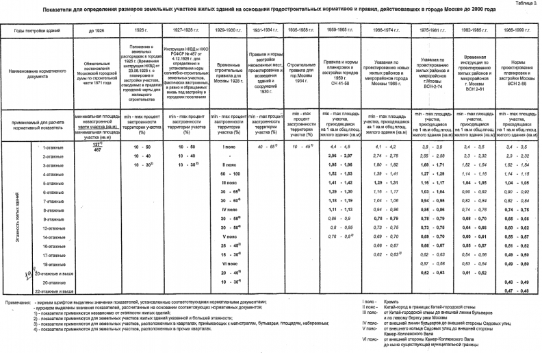 Показатели для определения размеров земельных участков жилых зданий на основании градостроительных нормальвов и правил, действующих в городе Москве до 2000 года.