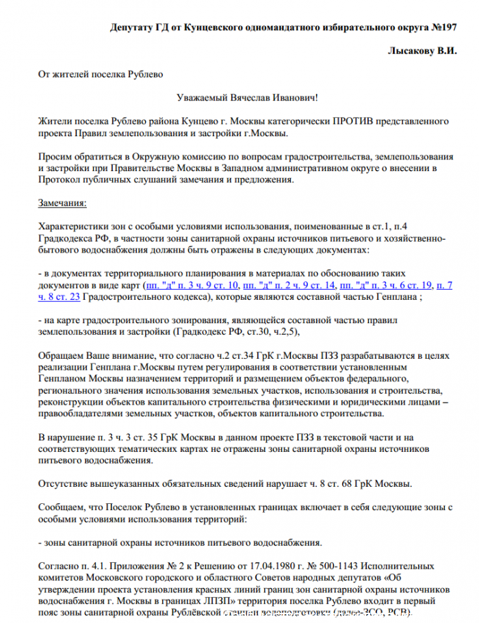 Групповое обращение к Лысакову о проведённых слушаниях в Кунцево по ПЗЗ