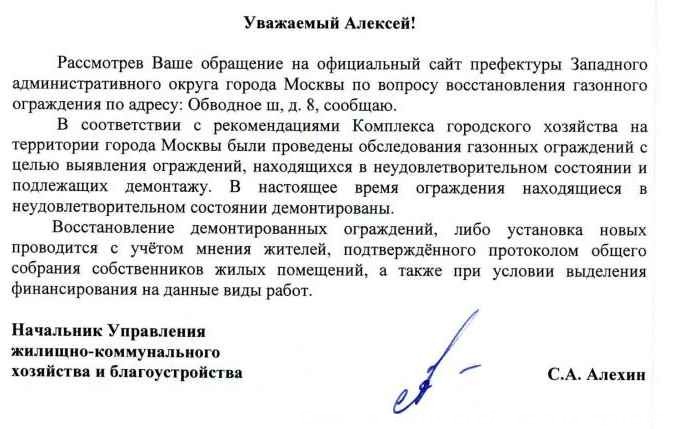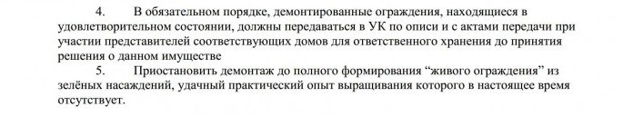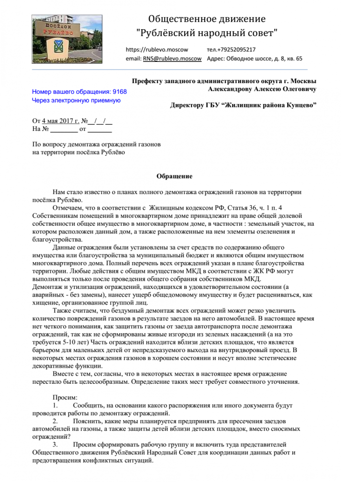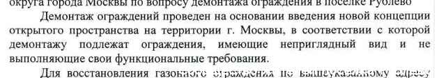 По вопросу демонтажа ограждений газонов на территории посёлка Рублёво