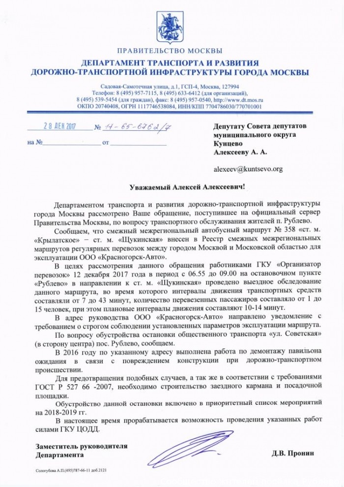 Уже продолжительное время я получаю жалобы на плохую организацию и работу маршрутного транспорта в п. Рублёво (г. Москва). Очень большое количество жалоб поступает на режим работы маршруток в сторону м. Шукинская (маршрут 358). Жители жалуются, что ждать маршрутку можно часами. График непрогнозируемый. Проблема усугубляется ещё и тем, что уже более 2 лет откладывается восстановление остановочного павильона на остановке «ул. Советская». Ещё в августе 2016 г. старый, но вполне пригодный павильон, был полностью демонтирован под предлогом необходимой реконструкции, а новый так и не установлен. Людям приходится ожидать автобус под открытым небом. Требуется срочное принятие мер. Прошу: 1. Дать указание провести проверку соблюдения нормативов г. Москвы относительно общественного транспорта в п. Рублёво указанного маршрута. 2. Дать указание проработать вопрос фиксации графика отправления на данном маршруте. 3. Принять срочные меры по скорейшему восстановлению остановочного павильона «уд. Советская». Сообщить предполагаемые сроки восстановления