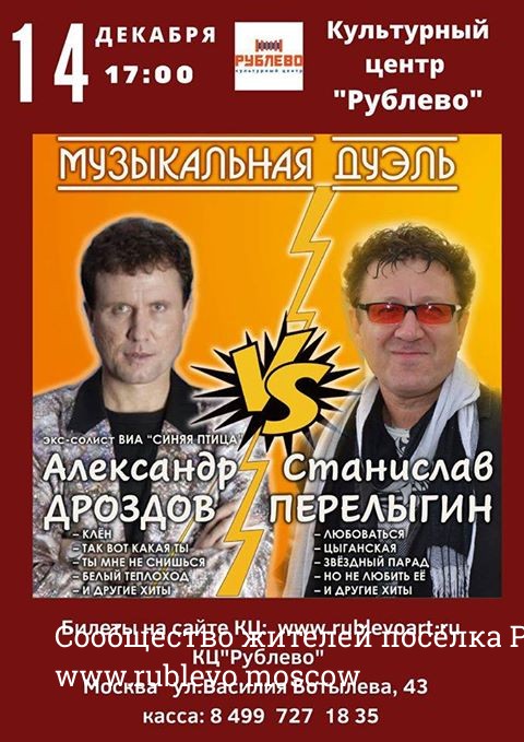 14 ДЕКАБРЯ на сцене культурного Центра Рублёво состоится самая настоящая (правда музыкальная...)дуэль!!))) «Музыкальная дуэль» - совершенно новый для КЦ "Рублёво" формат концерта. Это захватывающее музыкальное соревнование между двумя известными исполнителями, у каждого из которых свои поклонники и свои почитатели таланта. Станислав Перелыгин полюбился рублёвцам ещё в прошлом году, когда принимал участие в «Вечере шансона» («Цыганская», «Любоваться», «Но не любить её»). Это один из харизматичных исполнителей на нашей эстраде. В его песнях нет случайных слов, а сердце щедро раскрыто для эмоций и душевного общения со зрителем. Ценители жанра шансон любят этого музыканта и автора-исполнителя за неподражаемую, яркую индивидуальность. Станислав Перелыгин – победитель многих фестивалей и конкурсов, участник телевизионных программ. Место по другую сторону «барьера» займёт экс-солист ВИА «Синяя птица» Александр Дроздов, который два года назад тоже выходил на сцену нашего Культурного центра в составе этой популярной группы. Конечно же, вы помните бархатный голос, ласкающий слух, неповторимую манеру исполнения и харизму этого певца.( " Клён"," Так вот какая ты" и др.) Александр также является автором многих песен, которые очень нравятся слушателям ("Что такое нежность", " А я не верил", " Ну и пусть" и другие). В качестве «секундантов» выступят сами зрители, которым предстоит решить, кто же из двух талантливых музыкантов победил в этой музыкальной дуэли и кому они отдают предпочтение.