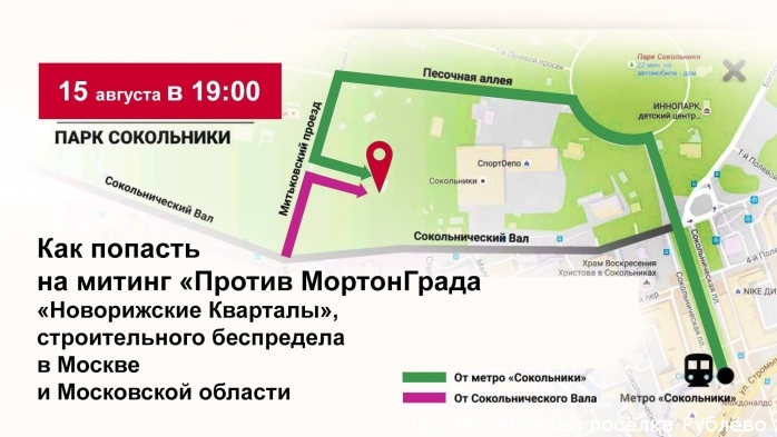 15 августа в 19.00 в парке Сокольники состоится согласованный митинг против экологической, транспортной и гуманитарной катастрофы, которая будет неизбежна в случае реализации проекта МортонГрада, а также планов по застройке Рублево-Архангельского и Рублево-Успенского анклавов Новой Москвы в долине Москвы-реки. Мы выступаем против массовой вырубки лесов, застройки парков и земель сельхозначения, загрязнения рек и слива канализации в источники питьевого водоснабжения. Мы против превращения Московского региона в непригодное для жизни многоэтажное гетто, с отравленным воздухом и водой. МортонГраду.нет -- за создание на западе Московской области национального парка "Московия", за устойчивое цивилизованное развитие региона, сохранение природного и культурного наследия. Мы приглашаем общественные движения, инициативные группы, жителей Подмосковья и Москвы выйти и поддержать нас.