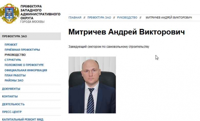 «Скромного» представителя Префектуры который отказывался представится опознали, это Митричев Андрей Викторович. Вот он на сайте префектуры. Указано что его должность «Заведующий сектором по самовольному строительству»
