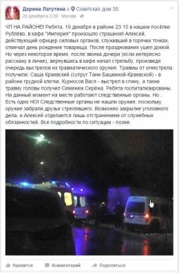 Ранее сообщалось, что три человека были ранены в результате стрельбы в кафе "Империя" в поселке Рублево на западе Москвы. Сообщение о стрельбе по адресу Москва, поселок Рублево, улица Советская, 30 поступило в полицию в 23:49 19 декабря.