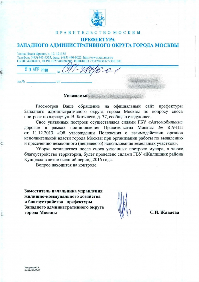 Ответственный за снос сотрудник Префектуры ЗАО — Самедов Ефив Естафаевич.»