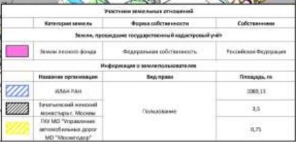 Плохо видно ( Розовые, кажется, форма собственности: земли лесного фонда, а штриховка — информация о землепользователе. Розовые заштрихованные — лесной фонд, ИЛАН (Институт лесоведения) РАН.