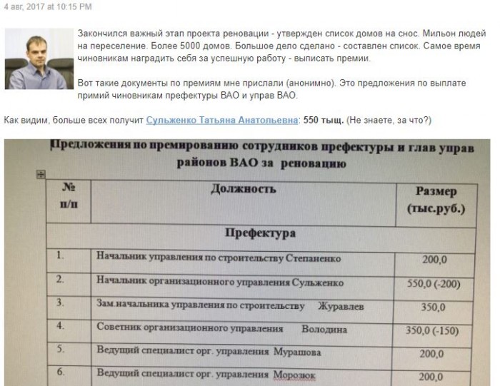 Премии чиновникам за реновацию. Из ЖЖ муниципального депутата Д.Барановского, Сев.Измайлово