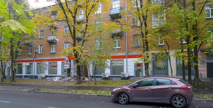 Из задумки архитектора остались крайний правый подъезд и два витринных окна (в общем-то, тоже достаточно испорченных, но не уничтоженных).