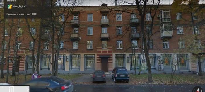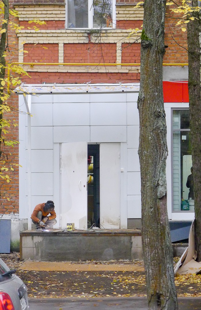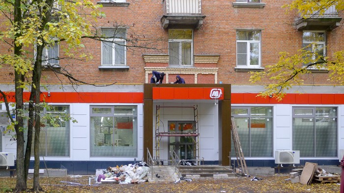 Одно из немногих зданий в Рублёво, которое было построено по индивидуальному проекту, с красивым фасадом, этот фасад потеряло. Красивое архитектурное оформление трёх фасадных подъездов, между которыми большие витринные окна, органично вписанные в «лицо» здания: Над подъездами были сохранены даже одинаковые козырьки с консолями, такими же как и над жилыми подъездами со стороны двора. Видимо, посчитали, что всё это архитектурное излишество ни к чему, и изуродовали фасад: Из задумки архитектора остались крайний правый подъезд и два витринных окна (в общем-то, тоже достаточно испорченных, но не уничтоженных).