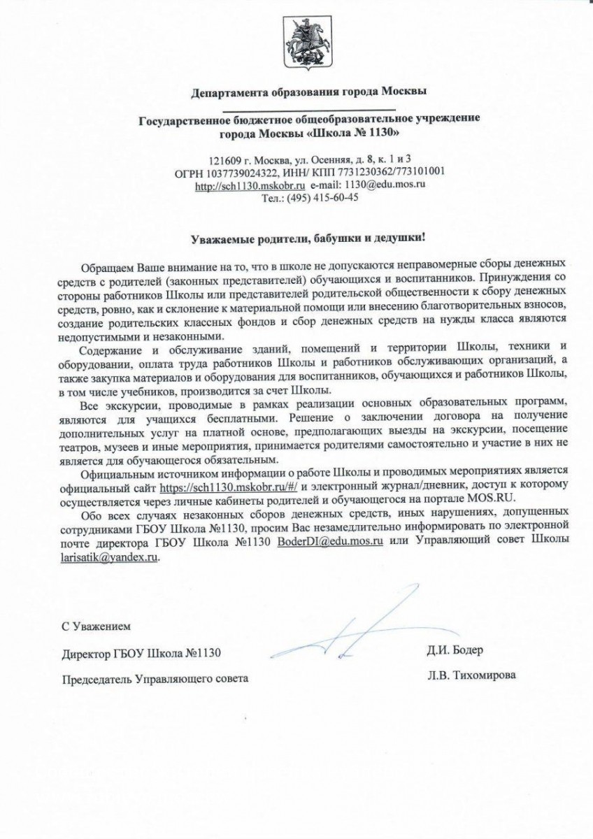 Директор школы № 1130 обращает внимание родителей, бабушек и дедушек своих учеников на то, что любые сборы денежных средств, склонение к материальной помощи, создание родительских классных фондов и сбор денег на нужды класса недопустимы и незаконны.