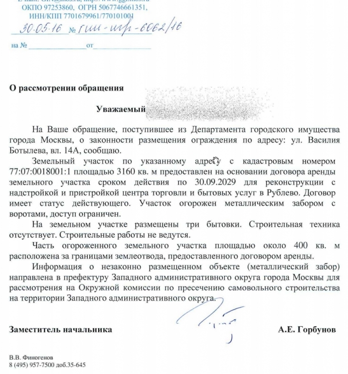 1. Ждём ответа из прокуратуры и Окр. Ком. по пресечению самовольного строительства.