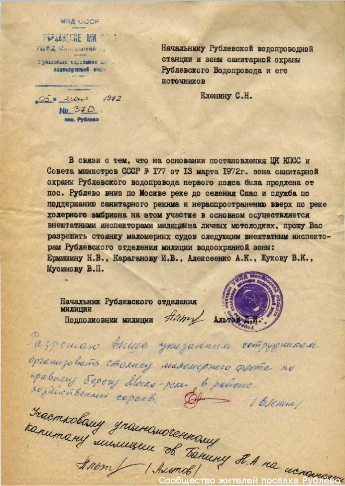 Правительство СССР приняло комплекс экстренных мер санитарно-карантинного характера, которые позволили взять ситуацию под контроль. Большую роль возложили на органы милиции. Первый пояс зоны санитарной охраны Рублёвской водопроводной станции продлили от пос. Рублёво вниз по реке до моста кольцевой дороги в районе селения Спас. К этому времени я прошел учебные сборы, закончил курсы мотористов и получил права на вождение катера. Меня сразу поставили на этот маршрут.