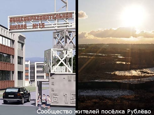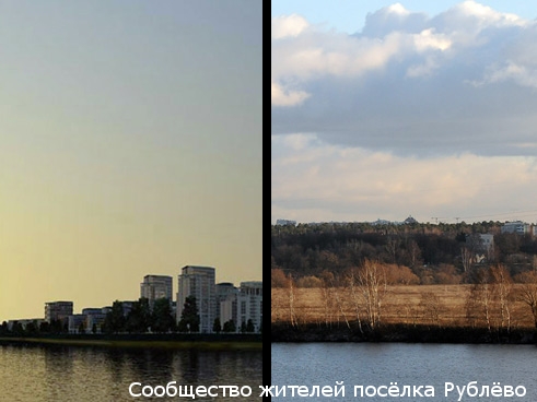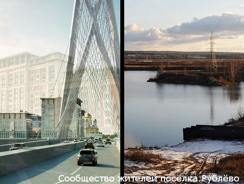 В левой части изображение с официального сайта ЗАО «Рублево-Архангельское», в правой — фотография, сделанная корреспондентом «Ведомостей» на месте, где должен был быть реализован проект