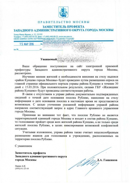 Некоторое время назад на сайте управы стартовало голосование "о целесообразности нанесения дополнительной надписи «РАЙОН КУНЦЕВО ГОРОДА МОСКВЫ» на стелу" при въезде в п. Рублёво.
