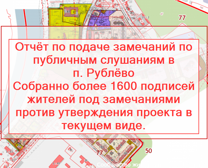 Как многие знают, 16 февраля в п.Рублёво проходили публичные слушания по Межеванию территории нашего посёлка. Хотим поделиться с вами результатам подачи групповых замечаний по представленным проектам.