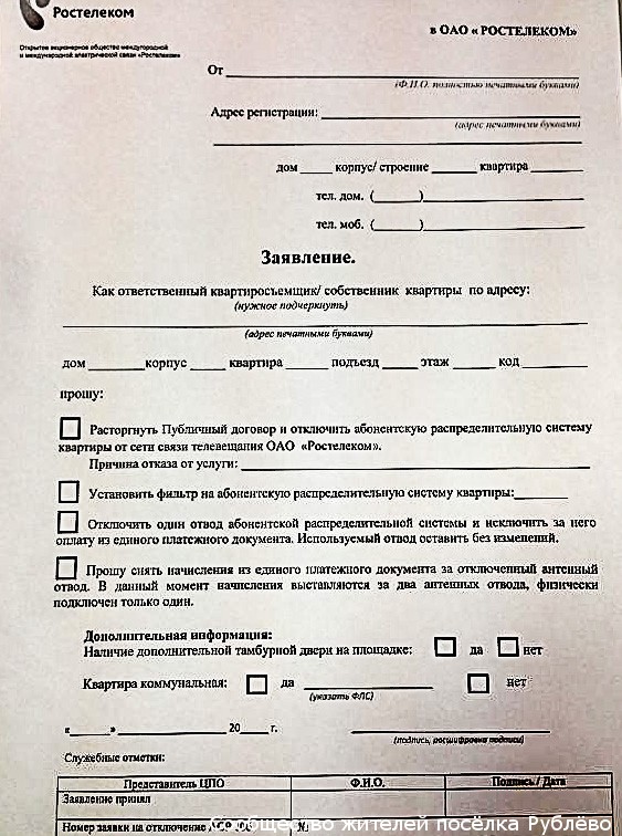 4. Заполнить бланк заявления на отключение телевизионной антенны.