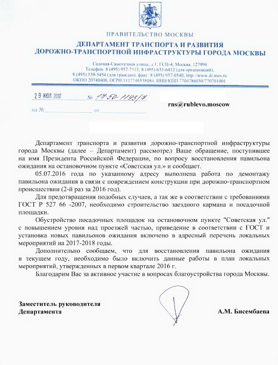 В своих ответах на несколько жалоб ведомство сообщило, что эти обстоятельства не столь важны, остановка есть и уже хорошо, а дополнительные мероприятия по улучшению безопасности и установки нового остановочного павильона будут только в будущем. Рекомендации были перенаправлены в Префектуру ЗАО г. Москвы.