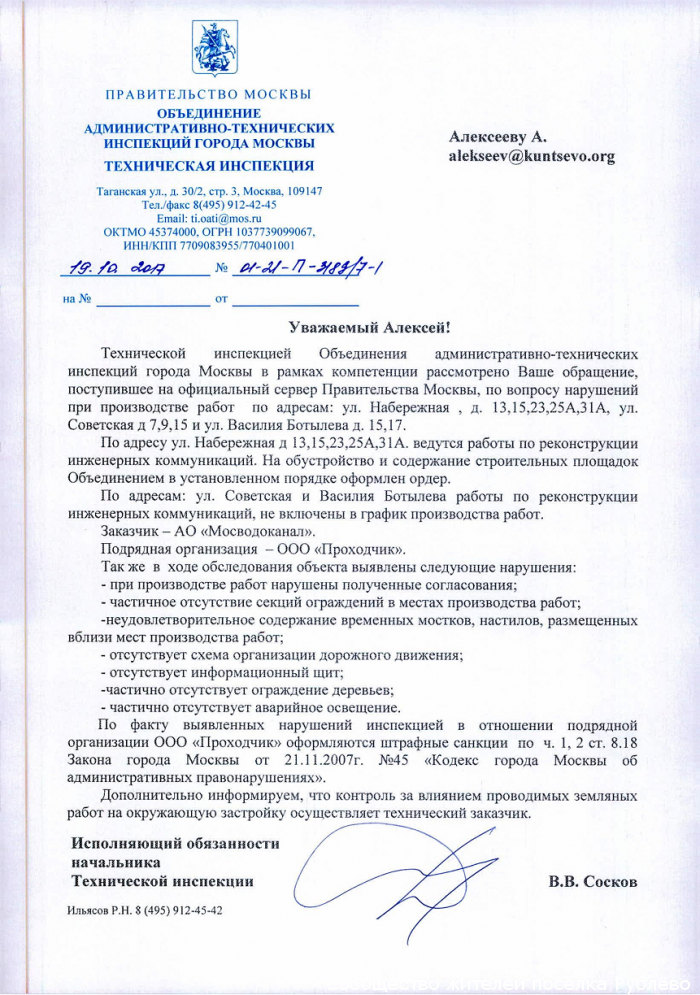 О нарушениях при проведении работ по прокладке водовода в Рублёво-Архангельское