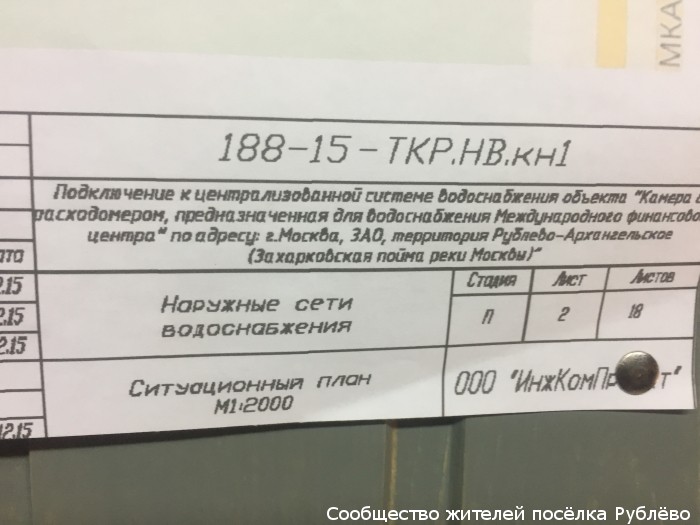 Вопрос о правомерности реализации проекта “Камера с расходомером, предназначенные для водоснабжения Международного финансового центра”, реализуемого на территории посёлка Рублёво, был также вынесен на заседание Совета депутатов муниципального округа Кунцево. Инициаторами стали наши депутаты А.Алексеев и В.Тюркин.