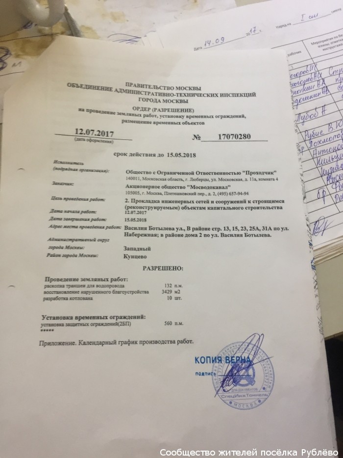 25 сентября 2017 года муниципальными депутатами района Кунцево вместе с группой активных жителей района был проведен осмотр строительной площадки объекта “Камера с расходомером, предназначенные для водоснабжения Международного финансового центра” в поселке Рублёво в районе улиц Советская, Василия Ботылева и Набережная.