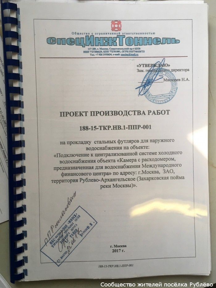 В письме поставлен вопрос о том, каким образом проекты ООО «СпецИнжТоннель» ППР 188-15ТКР.НВ.1-ППР-01 на прокладку к централизованной системы холодного водоснабжения Международного финансового центра» и ООО «ИнжКомПроект» 188-15-ПОС «Подключение к централизованной системе холодного водоснабжения объекта «Камера с расходомером, предназначенная для водоснабжения Международного финансового центра» оказались рабочей документацией, по которой ведутся работы к отменённому проекту МФЦ.