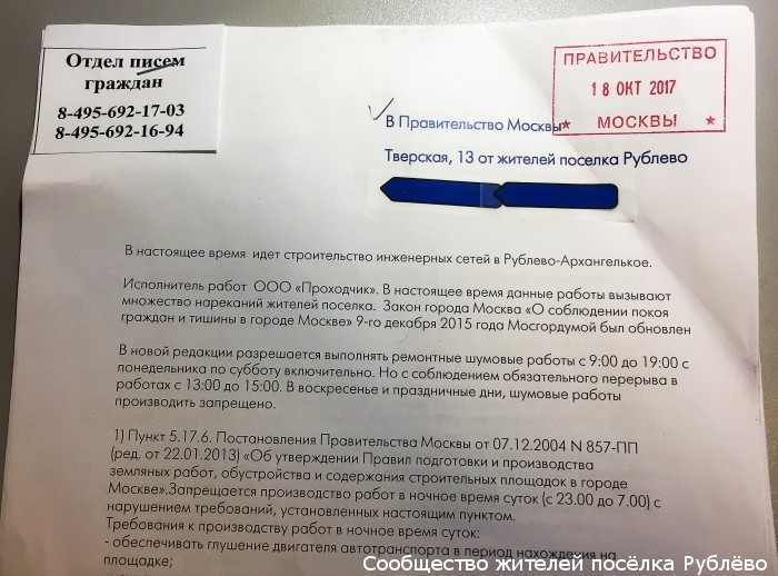 Так, к 19 октября обращение, подписанное 289 жителями нашего посёлка, передано в отдел писем Правительства Москвы. Копия данного письма будет также направлена в ещё несколько инстанций, в том числе нашим депутатам в Мосгордуме и Госдуме.