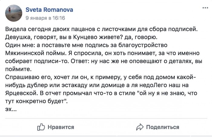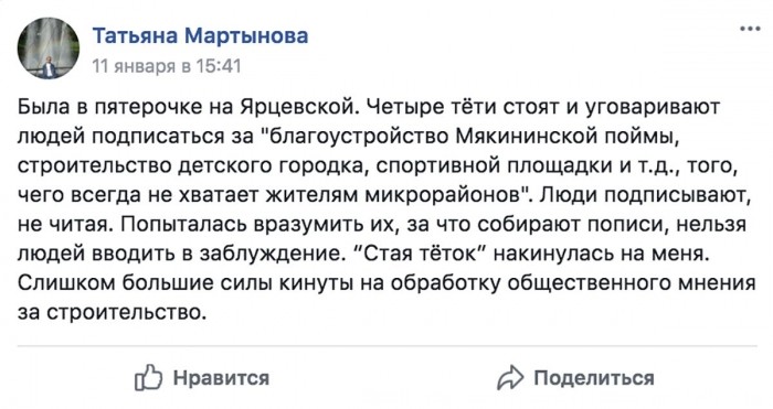 Параллельно с этим неизвестные начали распространять листовки в поддержку застройки. Как рассказали жители, к ним подходят молодые люди и просят поддержать проект, который якобы улучшит инфраструктуру района Кунцево.