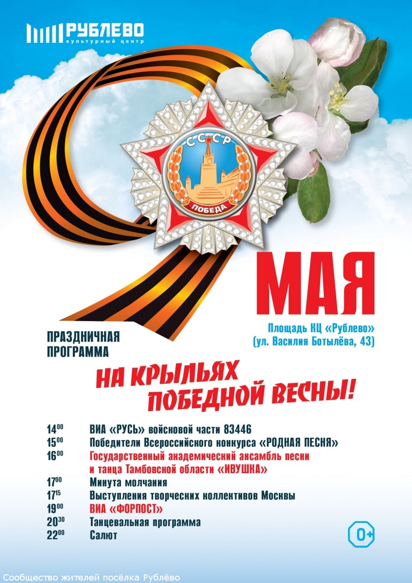 - праздничные мероприятия начнутся уже 7 мая с торжественного митинга и возложения венков к обелиску павшим в годы Великой Отечественной войны жителям поселка Рублёво. Начало в 12 часов.