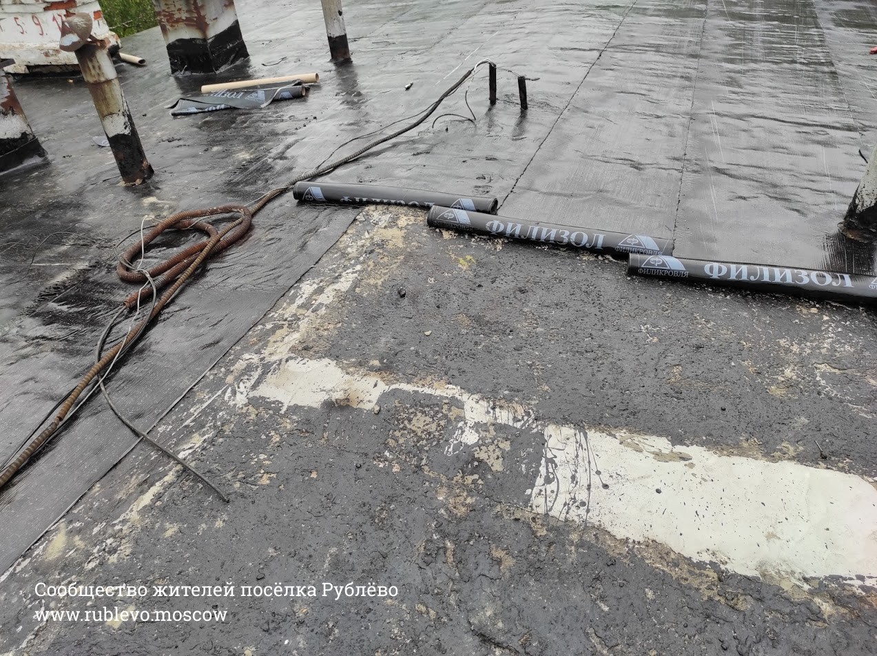 1. Подрядчик проводит работы по укладке гидроизоляционного покрытия без подготовительных работ: в соответствии со сметой необходимо провести выравнивающую стяжку на всей площади покрытия, затем провести предварительную обработку битумно-полимерной грунтовкой. По факту, рулонная гидроизоляция укладывалась на старое неподготовленное основание.